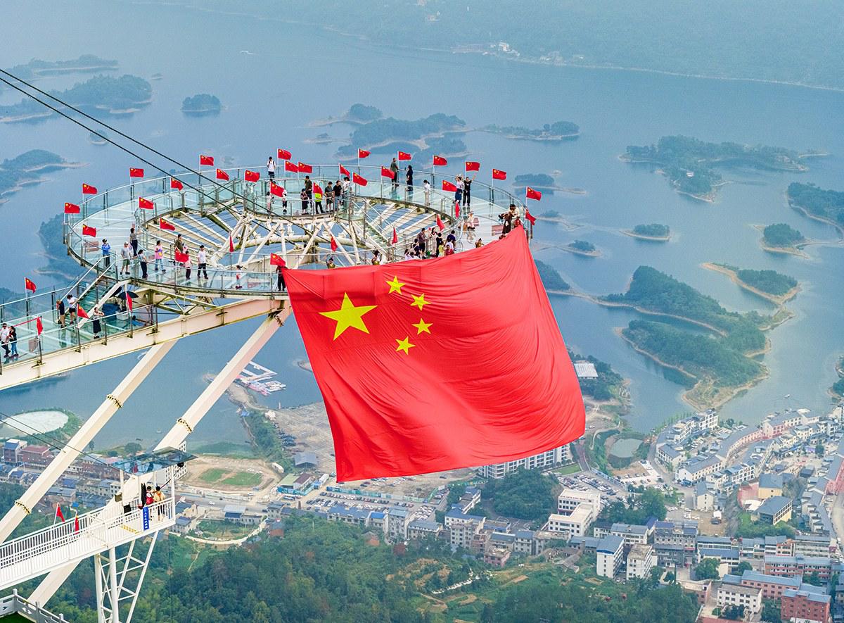 10月1日,陽新仙島湖景區(qū)游人如織。游客紛紛登上“天空之鏡”玻璃觀景平臺欣賞仙島湖風(fēng)光,盡享美好假期。記者 周巍 攝