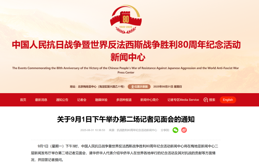 9月1日(星期一)下午3時(shí),中國人民抗日戰(zhàn)爭暨世界反法西斯戰(zhàn)爭勝利80周年紀(jì)念活動(dòng)新聞中心將在梅地亞新聞中心二層新聞發(fā)布廳舉辦第二場(chǎng)記者見面會(huì),請(qǐng)華僑華人代表介紹華僑華人在世界各地舉行的紀(jì)念活動(dòng)及其對(duì)抗戰(zhàn)的貢獻(xiàn)等方面情況,并回答記者提問。