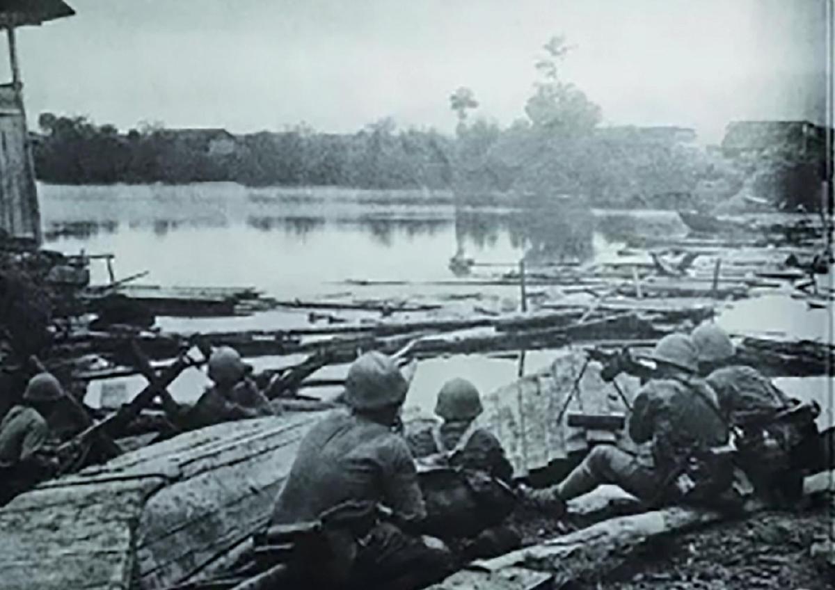 1938年10月2日,富水河岸。侵華日軍藤岡部隊(duì)的機(jī)槍手正在向中國守軍掃射。